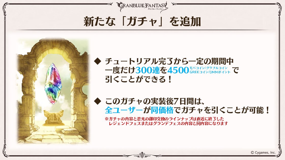 最初の発表を素直に文面通りで読み取るなら、①4500円を支払うと300連引く権利が取得可能②300回引くと通常通りにリストの武器or石を輝石交換可能③リストはガチャの購入権利取得時点を基準に、その直前のフェスが対象④購入権利取得は、新規の場合は登録して開始する時期次第でフェスがレジェンド・グランデのどちらかになる④既存登録者は基本的に購入不可だが、救済措置として「4500円ガチャ実装からX日間のみ購入可能」となる・・・で、この④は実装時期が不明だから「レジェorンデのどちらか」なんだけど、実際には運営が実装した日付基準で固定されるから購入者であるプレイヤーは何をどうやっても選べない…となるはず